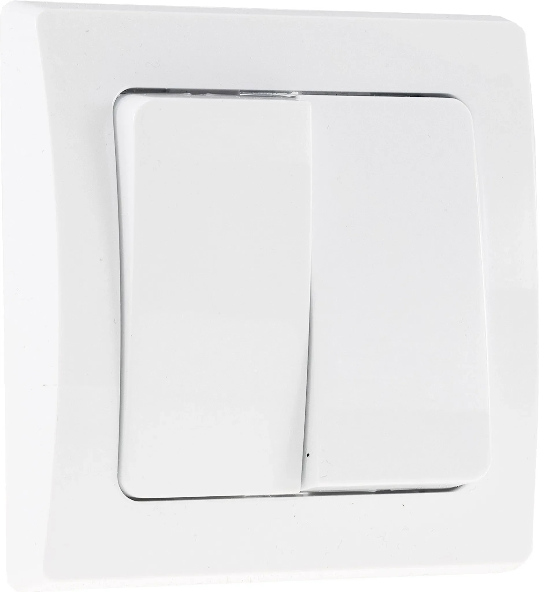Highlights: Eleganter 2-fach Unterputz-Schalter, reinweiße Oberfläche, einfach zu montieren, robustes Kunststoffgehäuse, ideal für Wohnräume und Büros, kompatibel mit Längs- und Quermontage.