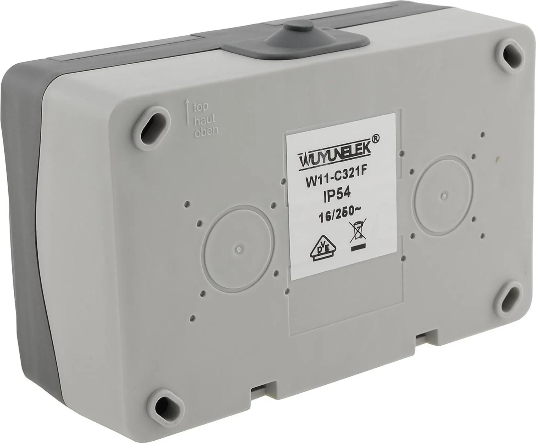 Highlights: Spritzwassergeschützt (IP54), horizontal angeordnet, zwei Schutzkontakt-Steckdosen, gummierte Kabeleinführung, stabile und wetterbeständige Konstruktion, schraubenlose Terminals, ideal für Feuchträume.