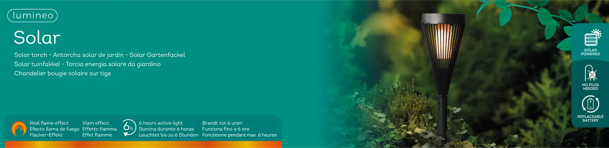 Highlights: Realistischer Flammeneffekt, kabelloser Solarbetrieb, automatische Dämmerungsschaltung, ideal als Wege- und Gartenbeleuchtung.