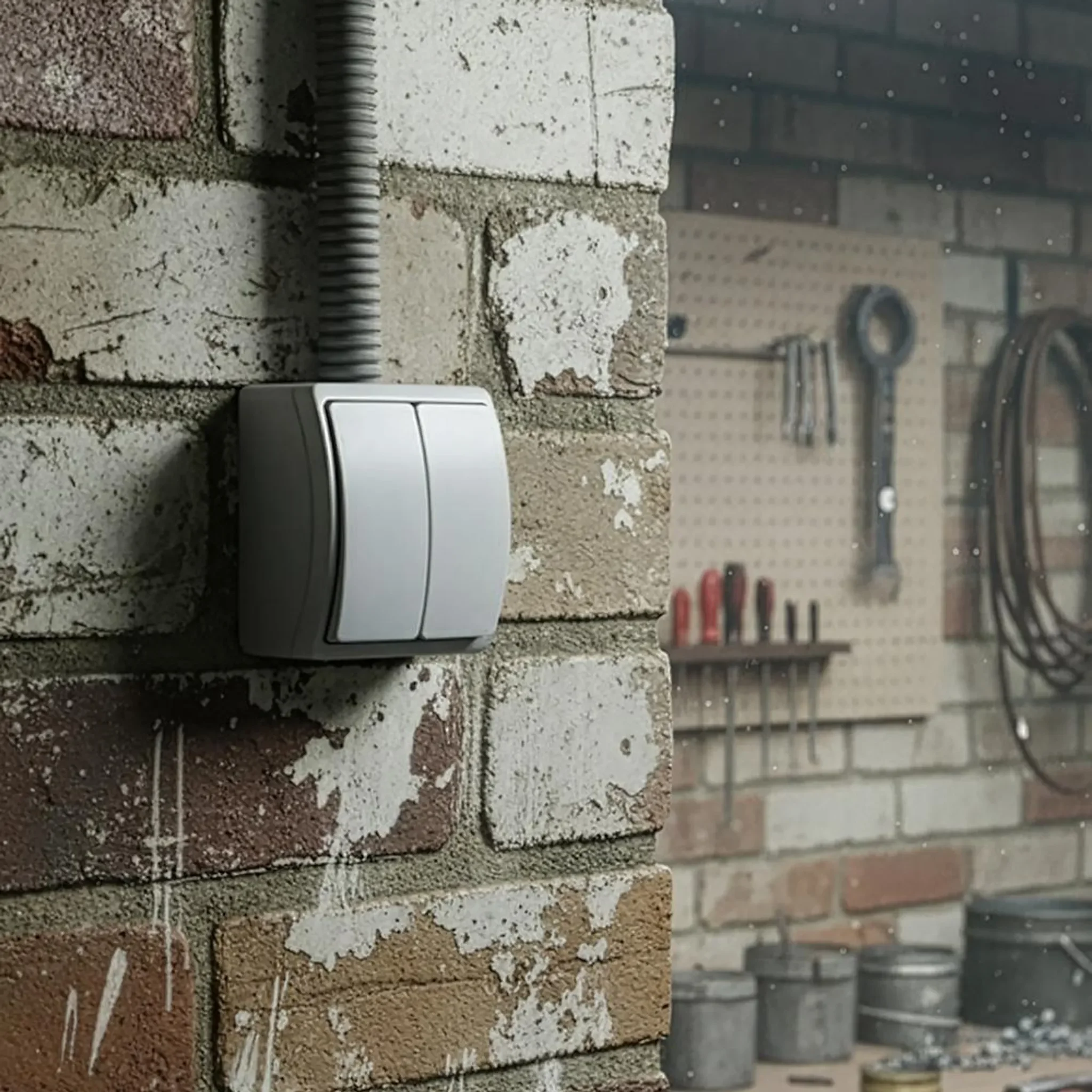 Highlights: Spritzwassergeschütztes IP44-Gehäuse, widerstandsfähige Oberfläche in Grau/Graphit, einfache Aufputzmontage, zuverlässige Schaltfunktion für Innen- und geschützte Außenbereiche.